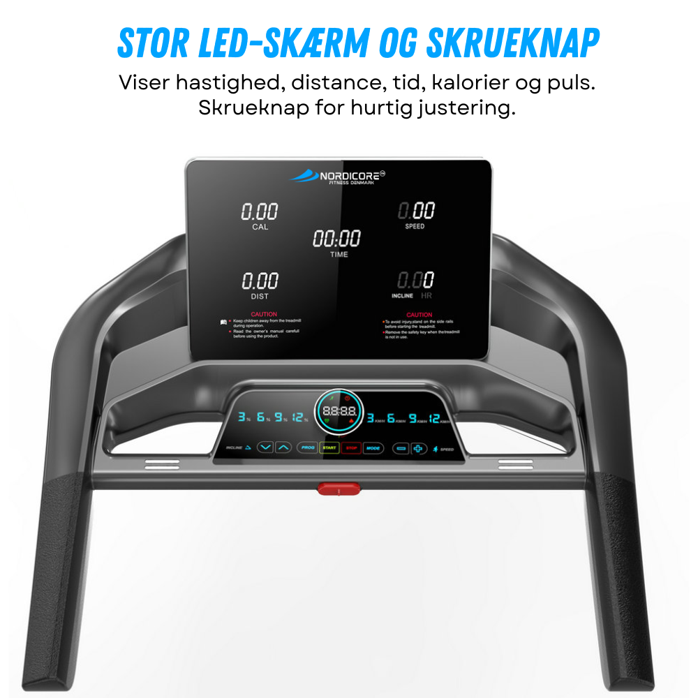 Stor LED-skærm viser hastighed, distance, tid, kalorier og puls